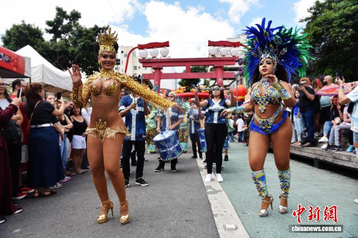 当地时间2月28日,巴西圣保罗自由区,巴西华侨协会与19家浙籍华社举行元宵游园活动。图为桑巴舞校的表演者在游行中。中新社记者 林春茵 摄
