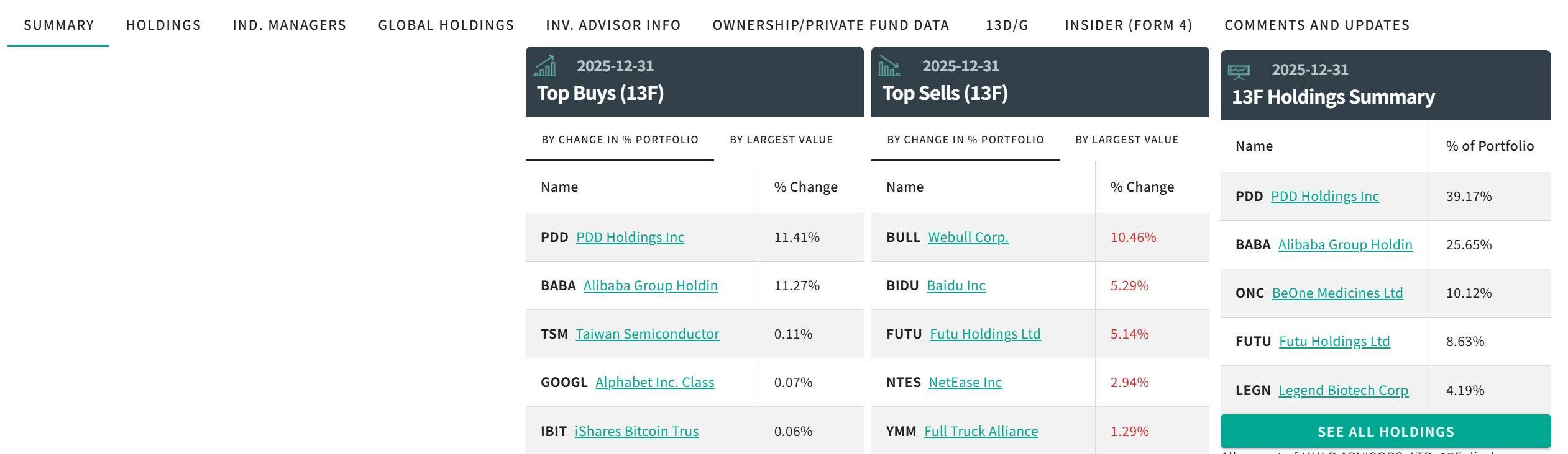 具体来看,HHLR第四季度的调仓核心聚焦中概电商龙头,拼多多与阿里巴巴构成组合“双核心”,合计占比达65%。其中,第一大重仓股拼多多获大幅增持,持仓市值12.16亿美元,占比从28%升至39%;第二大重仓股阿里巴巴持仓市值7.96亿美元,占比从14.4%大幅提升至26%。