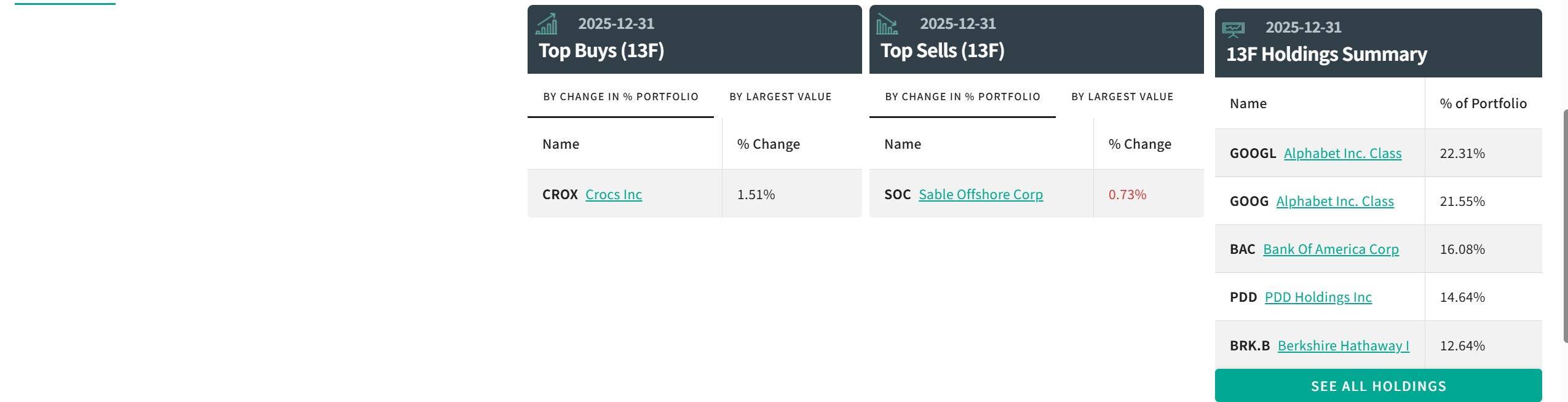 持仓结构依旧高度集中,前四大持仓(谷歌、美国银行、拼多多、伯克希尔·哈撒韦B)合计占比超87%。
