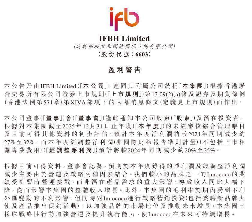 近日,IFBH(06603)发布公告,预计截至2025年12月31日止年度净利润将较2024年同期减少约27%至32%。经调整净利润(不包括上市相关专业费用)预计将较2024年同期减少约20%至25%。