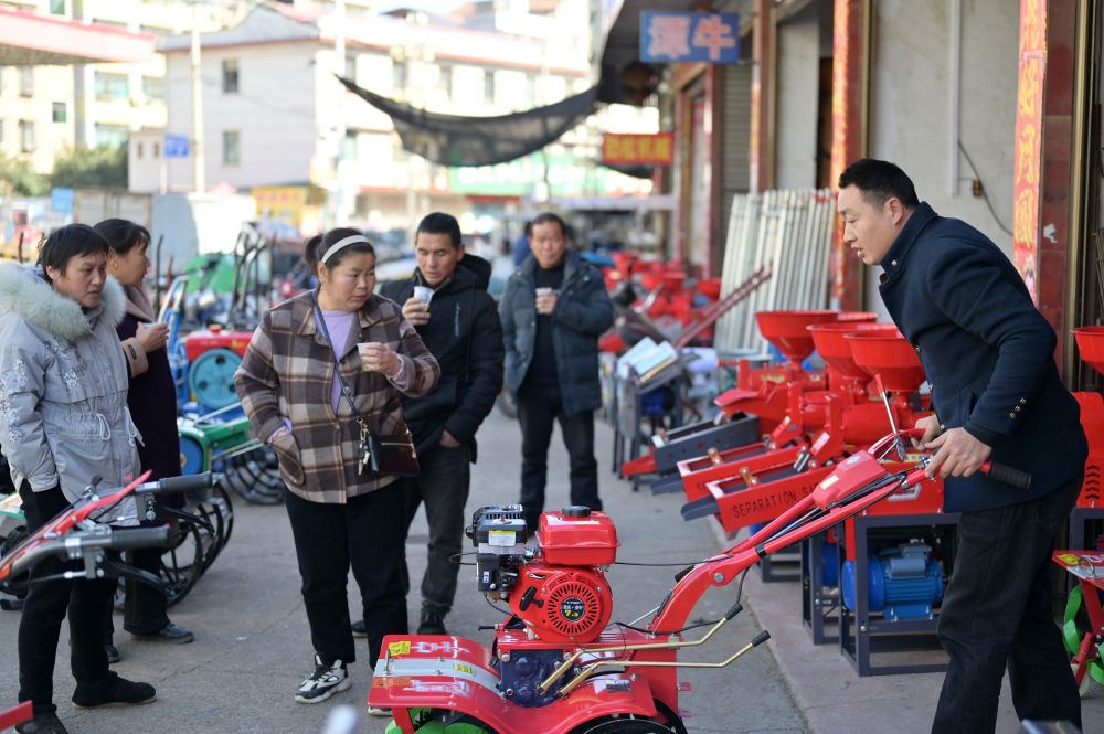2025年2月9日,在湖南省娄底市双峰县农机市场,农户在选购小农机。新华社发(李建新摄)