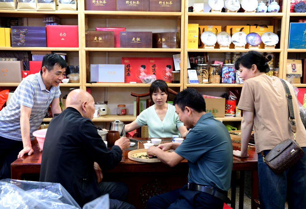 在福建省安溪县的中国茶都茶叶市场,茶商在市场店铺里拣选铁观音毛茶(2024年5月8日摄)。新华社记者魏培全摄