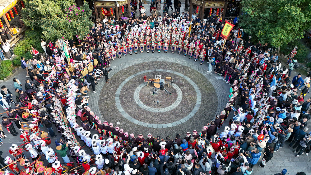 2024年11月30日,侗族群众在贵州省黔东南苗族侗族自治州黎平县肇兴侗寨进行文艺表演(无人机照片)。新华社发(王纯亮摄)