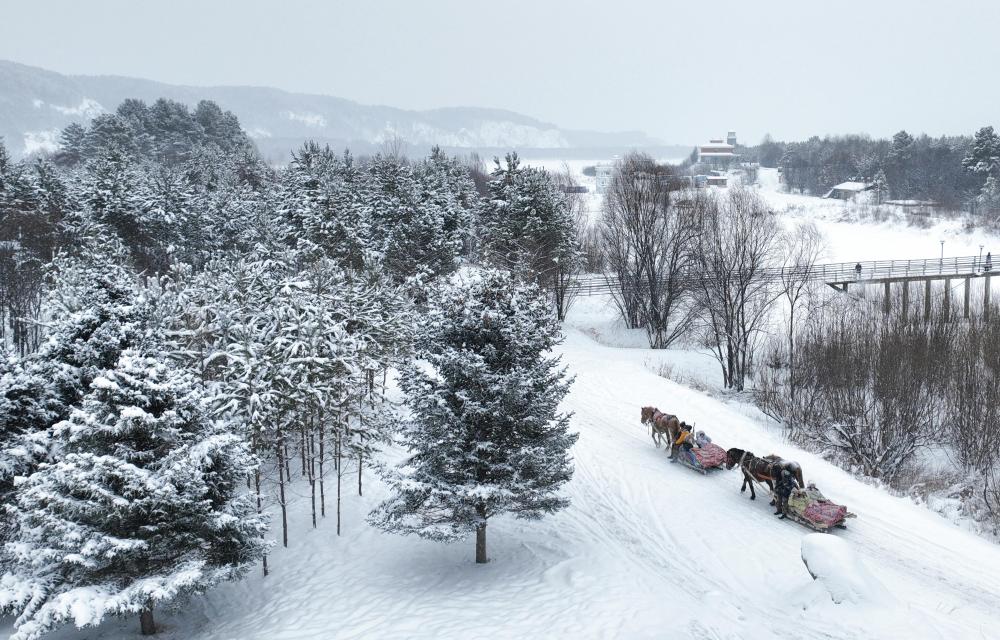 2024年11月27日,游客在黑龙江省漠河市北极村体验马拉爬犁项目(无人机照片)。新华社发(徐率摄)