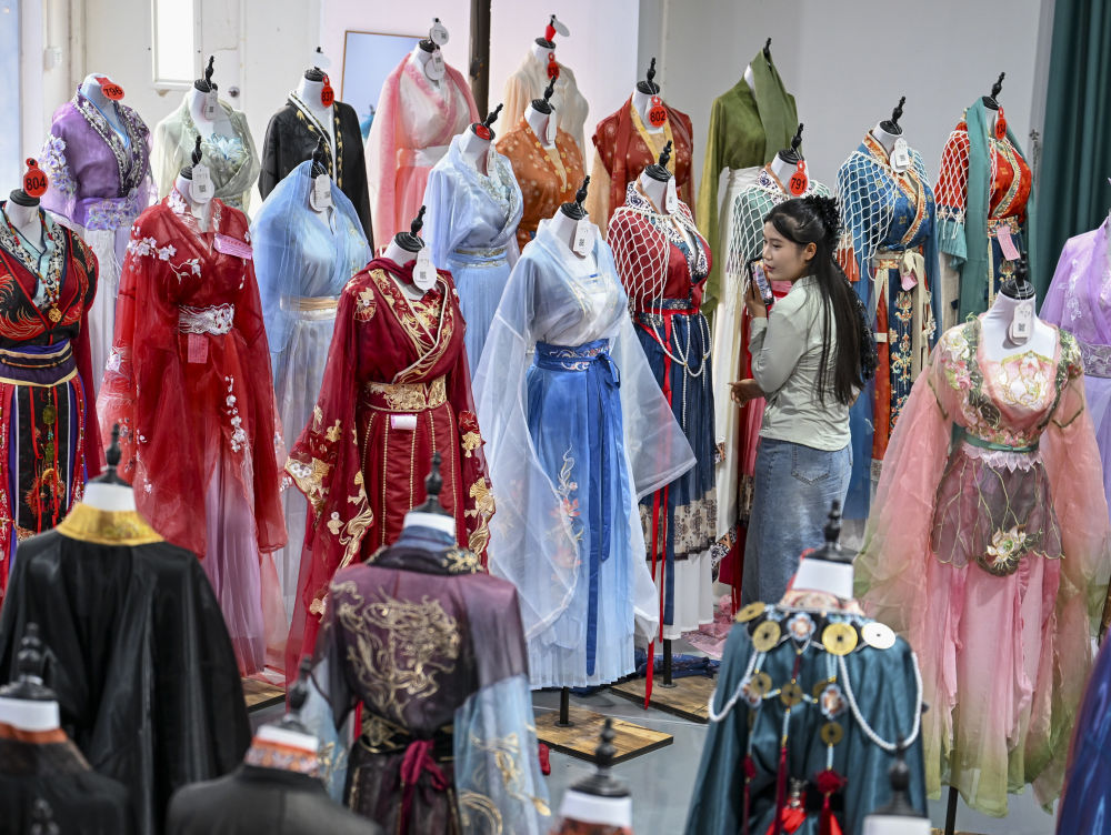 2025年6月17日,在山东省菏泽市曹县有爱云仓汉服基地,工作人员直播推介汉服。新华社记者徐嘉懿摄