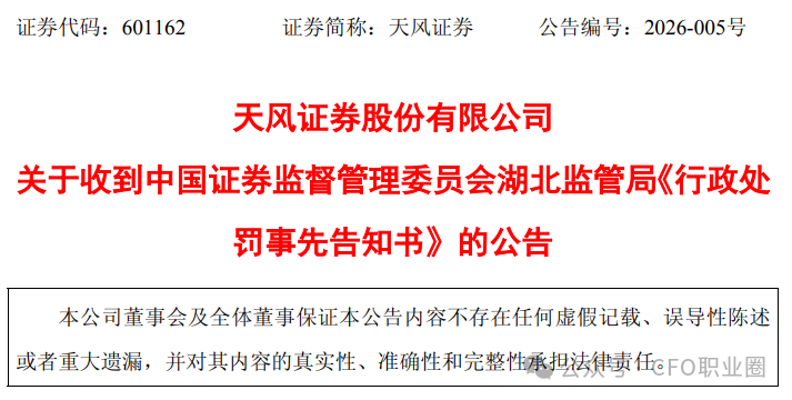 2026年2月14日,上交所主板上市公司天风证券(维权)(601162.SH)发布了《关于收到中国证券监督管理委员会湖北监管局《行政处罚事先告知书》的公告》(详见文末)。公告显示,公司收到湖北证监局《行政处罚事先告知书》,因涉嫌为股东及关联人提供融资、未按规定披露信息导致2020年至2022年年度报告存在重大遗漏,拟对公司给予警告并处以1500万元罚款;对时任董事长余磊、副总裁兼财务总监许欣等多名责任人予以警告并处罚款,其中财务总监许欣被罚款600万元(两项违法行为合计),并被采取终身证券市场禁入措施。公司表示诚恳接受处罚并已着手整改。